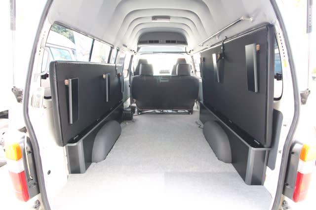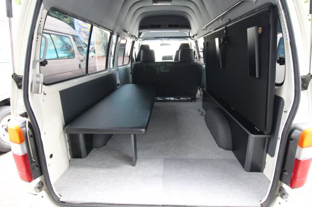 100系ハイエースバン スーパーロング ベッド架装 2016年10月5日 最終更新日時 : 2026年1月28日 north-mountain 過去の製作日記 2016.10.5ハイエースバンのベッド製作です。いわゆるトランスポーター兼車中泊仕様です。巷では跳ね上げベッドキットなんて言われてますね🎵当社ではすべて手作りなんですよ!!長さ1820mm 右側のみベッドにすると・・・ 左側のみベッドにすると・・・ 両側ベッドを跳ね上げると・・・ 荷物を積むスペースを確保しつつ、車中泊もできる。10秒でベッドになるのでとても楽ですね🎵今回ベッド天板の表皮はブラックレザーですが、触り心地の良い布地にもできますよ!!
