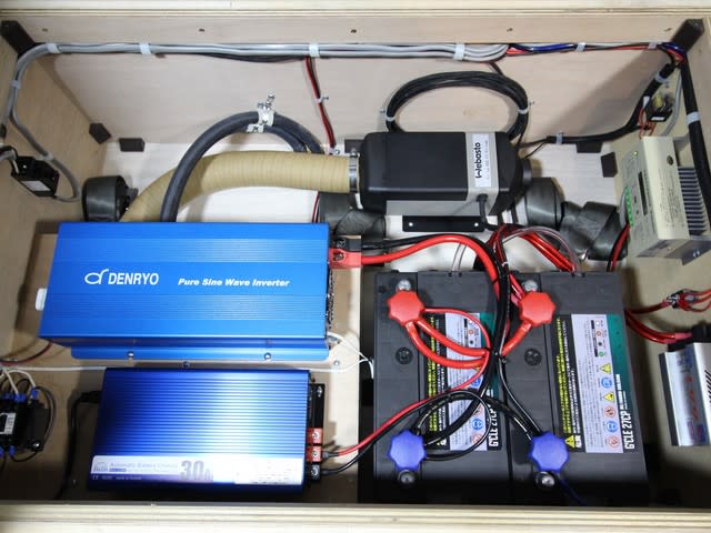 ツインサブバッテリー、1500Wインバーター、走行充電、外部充電、ソーラー充電、ベバスト製FFヒーター、車両走行ヒーターなど